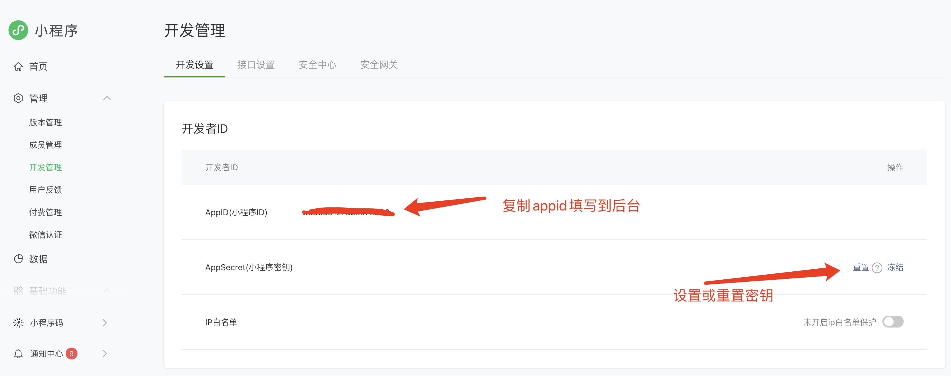 登录小程序后台,获取相关配置 左侧菜单 -> 管理 -> 开发管理